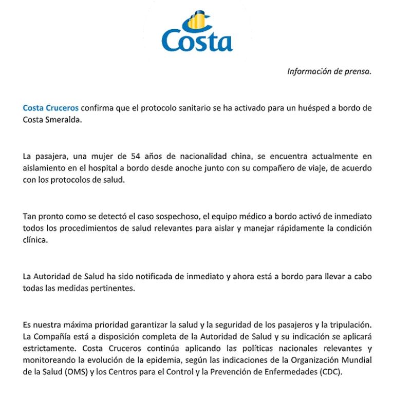 La firma de cruceros italiana explicó que “activó el protocolo para un caso sospechoso relacionado con un huésped de Macao actualmente a bordo de Costa Smeralda”, según el comunicado oficial. “La mujer, de 54 años, fue puesta en un cuarto aislado de la enfermería de a bordo junto con su compañero de viaje”, precisó.