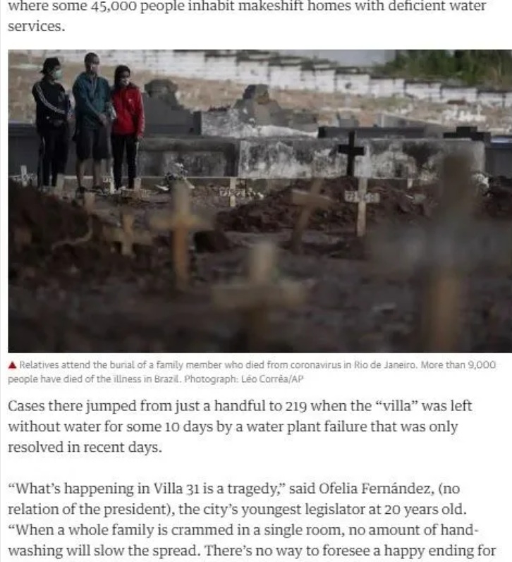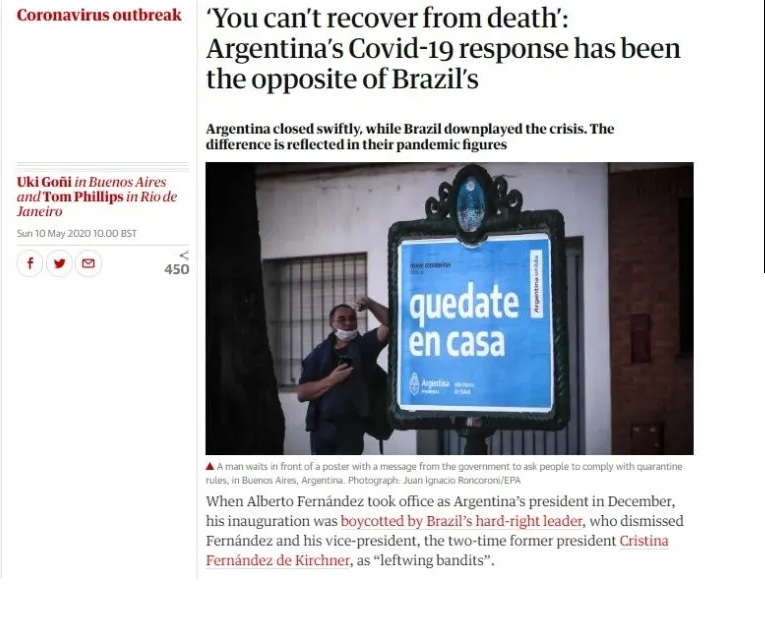 "Te podés recuperar de una caída en el PBI, pero no podés recuperarte de la muerte", es la frase de Alberto Fernández con la que The Guardian tituló la nota, que además compara: "Con solo 5,611 casos y 293 muertes hasta el momento, contra los casi 136,000 casos de Brasil y más de 9,100 muertes, incluso los partidarios acérrimos de Bolsonaro están mirando ahora a su vecino del sur con una mirada envidiosa".