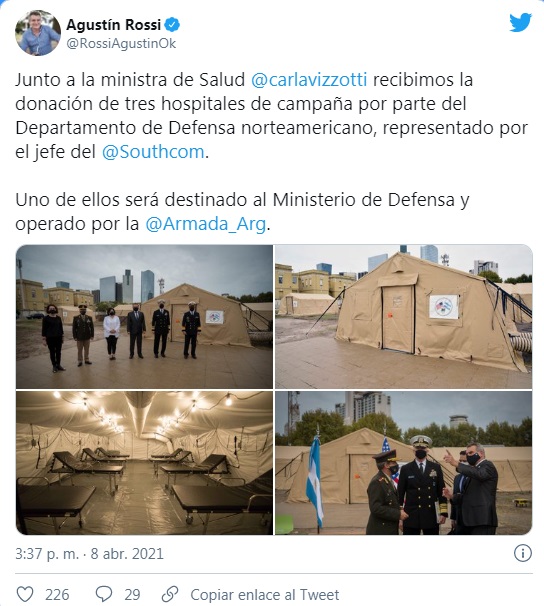 Tres hospitales modulares entregados por el Comando Sur de los Estados Unidos reforzarán el sistema de atención de la salud contra el coronavirus en Argentina, en esta segunda ola de coronavirus, ya que pueden utilizarse como centros de vacunación, aislamiento o salas de atención de baja complejidad, anunciaron este jueves la ministra de Salud, Carla Vizzotti, y su par de Defensa, Agustín Rossi.