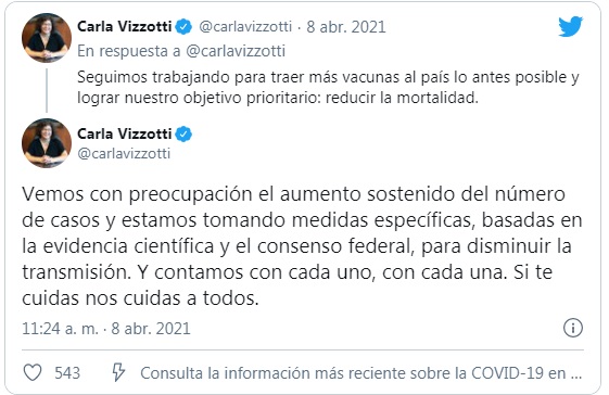 Vizzotti aclaró que "las medidas en el país son para la circulación entre jurisdicciones, y para situaciones donde se ha comprobado una importante cantidad de contagios como los viajes de egresados".