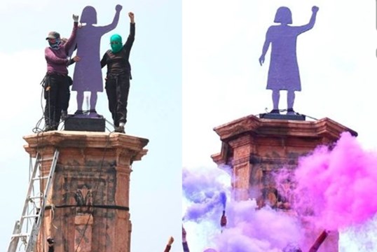 Mujeres encapuchadas escalaron por el pedestal, ubicado en una rotonda del céntrico Paseo de la Reforma, para instalar y desvelar la figura de una mujer con el puño en alto.
