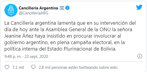 Por su parte, desde la Cancillería argentina contestaron a la denuncia de Áñez, a través de un comunicado que fue publicado en la cuenta oficial de Twitter: "La Cancillería argentina lamenta que en su intervención del día de hoy ante la Asamblea General de la ONU la señora Jeanine Áñez haya insistido en procurar involucrar al gobierno argentino, en plena campaña electoral, en la política interna del Estado Plurinacional de Bolivia".