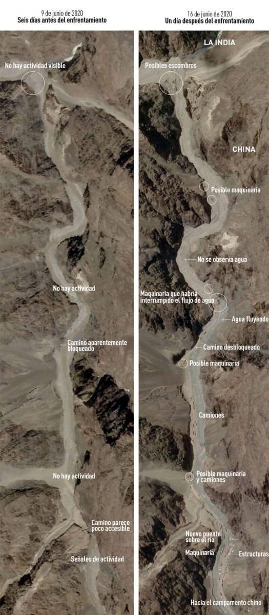 Según Reuters, la India sostiene que la zona donde han aparecido las construcciones chinas están en su lado de la línea de control real, la frontera efectiva entre los dos gigantes asiáticos. Por su parte, Pekín defiende que la totalidad del valle del Galwan, situado a unos 4.300 metros de altura, es territorio chino y culpa a los militares indios de desatar el conflicto.