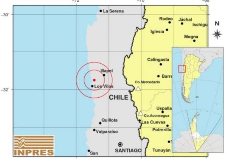 Según los primeros datos del Inpres, el sitio exacto del sismo fue entre Los Vilos e Illapel. Además, en referencia al país, fue 275 kilómetros al noroeste de Mendoza; 280 kilómetros al oeste de San Juan.