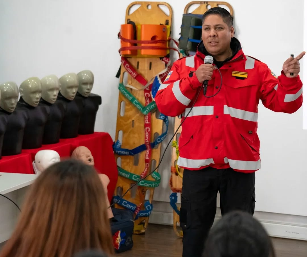 Durante el encuentro, personal de la División Centro de Entrenamiento de Bomberos brindó herramientas fundamentales en primeros auxilios y RCP, abordando tanto conceptos básicos como técnicas de intervención.