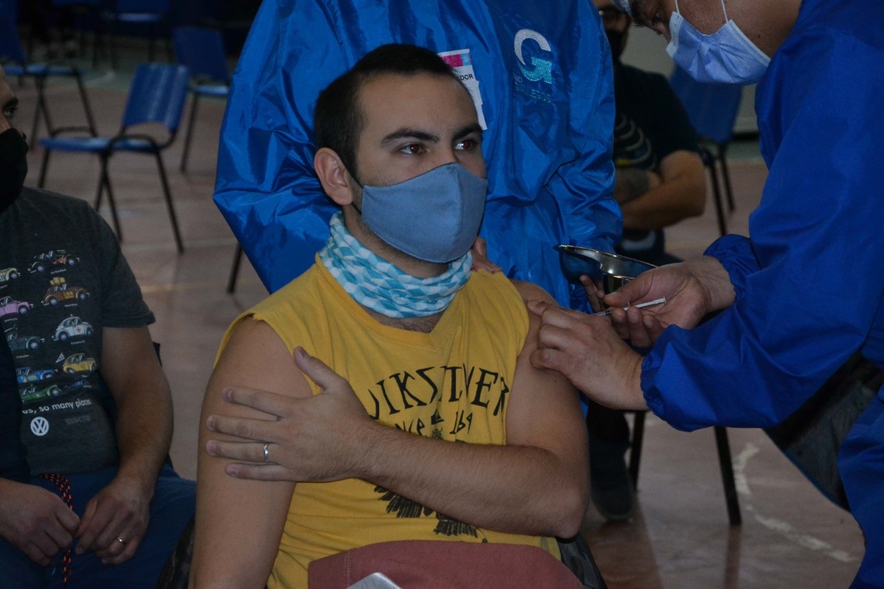 Joaquín con 31 años recibió la primera dosis de Sinopharm en el Centro de Vacunación Municipal que funciona en el Gimnasio “17 de Octubre”: “Por suerte tenemos la posibilidad de avanzar con esta vacunación que es tan importante para toda la población”.