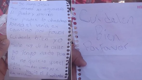 “Se llama Jesús. Su mamá no aguantó el parto y murió. Su padre lo abandonó apenas él venía en camino. Por favor, cuídenlo bien, yo solo soy de la calle y no tengo nada para él. No quiero que él pase hambre como yo ni frío. Nació el 8 de septiembre a las 04:30 am. Cuídenlo bien, por favor”, explicaba la nota que estaba junto al chiquito.