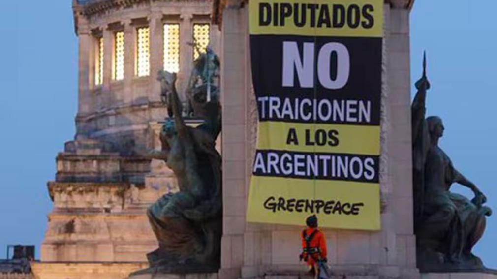 Son nueve las personas que atravesaron las rejas de la plaza para treparse de la escultura. Dos de ellas se colgaron con un arnés e instalaron un cartel de Greenpeace que dice: “Diputados, no traicionen a los argentinos”.
