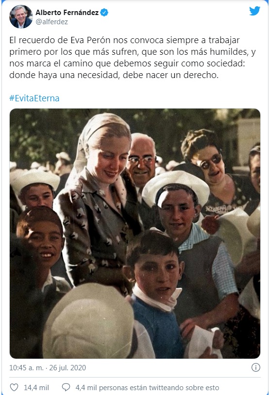 "El recuerdo de Eva Perón nos convoca siempre a trabajar primero por los que más sufren, que son los más humildes, y nos marca el camino que debemos seguir como sociedad: donde haya una necesidad, debe nacer un derecho", escribió el Presidente en su cuenta oficial de Twitter.