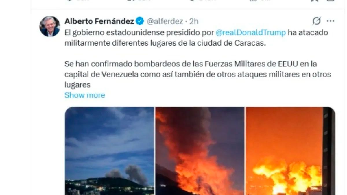 Alberto Fernández apuntó este sábado contra el presidente Donald Trump luego de la intervención militar durante la madrugada del sábado que derivó en la detención y salida de Venezuela de Nicolás Maduro junto a su esposa Cilia Flores. En el mismo mensaje, en la red social X, el exmandatario también le pidió al gobierno de Javier Milei que "deje de apoyar semejante atropello".