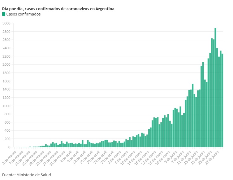 El Ministerio de Salud informó este martes 2262 nuevos casos de coronavirus en Argentina y el total de infectados ascendió a 64.530.