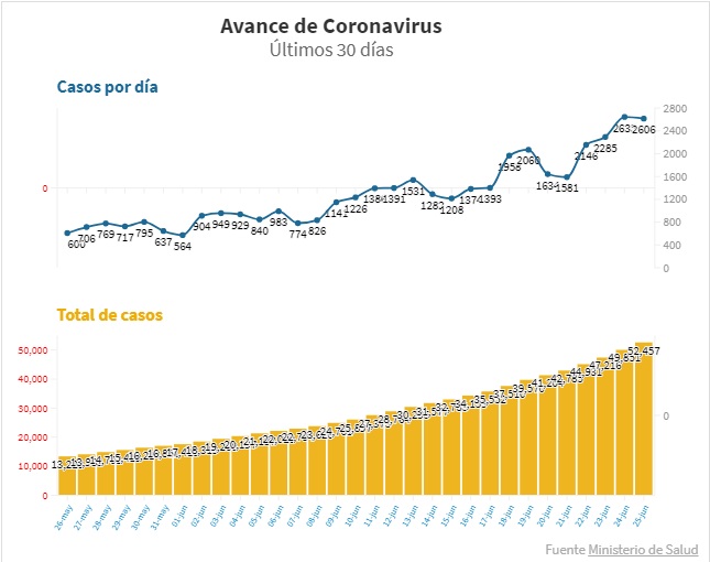 Este jueves, en el reporte vespertino, el Ministerio de Salud de la Nación confirmó 2.606 nuevos casos de Covid-19. Con estos registros, suman 52.457 positivos en el país.