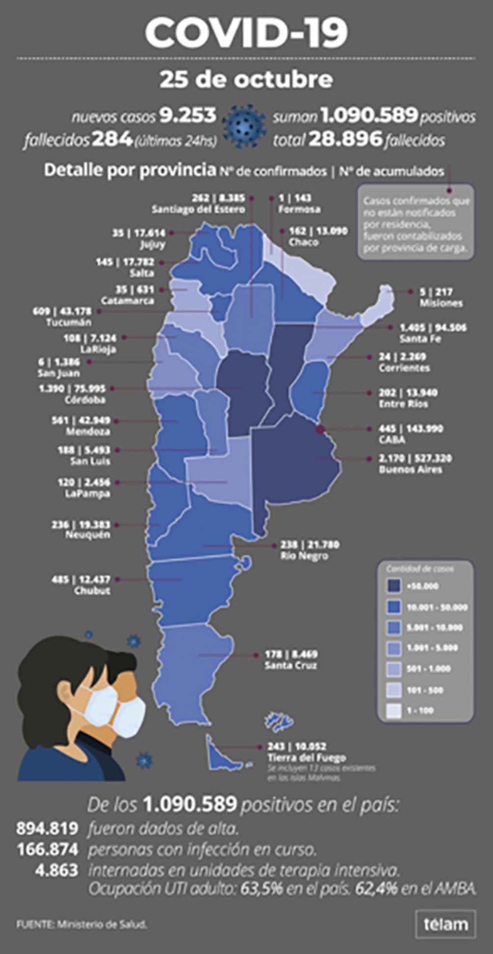 Un 28,26% (2.615 personas) de los infectados de hoy (9.253) corresponden a la Ciudad y a la Provincia de Buenos Aires.