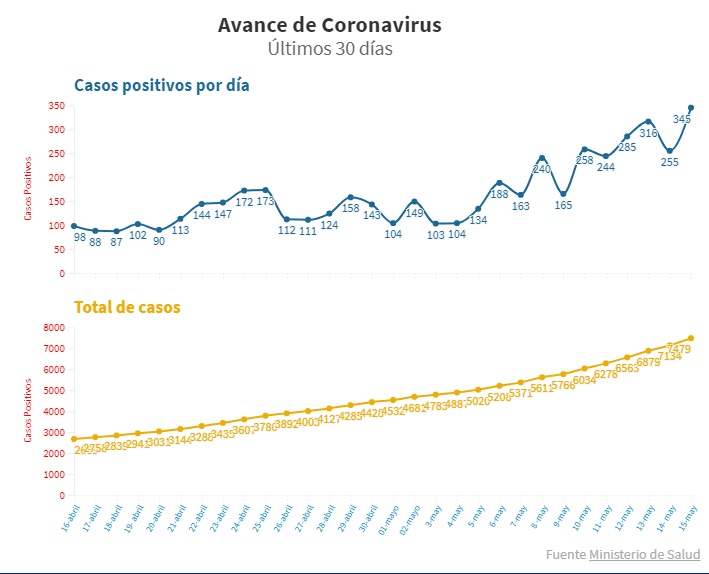 En su reporte vespertino el Ministerio de Salud de la Nación confirmó 345 nuevos casos de COVID-19. Con estos registros, suman 7.479 positivos en el país.