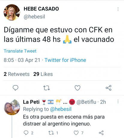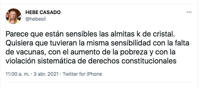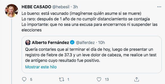 Pero de no solidarizarse en forma rápida a desear el mal hay un paso que podría ser largo pero que al final fue corto: la diputada provincial por Mendoza Hebe Casado en la red social Twitter con el símbolo de rezar pidió que la vicepresidenta Cristina Kirchner haya sido contacto estrecho de Alberto Fernández.