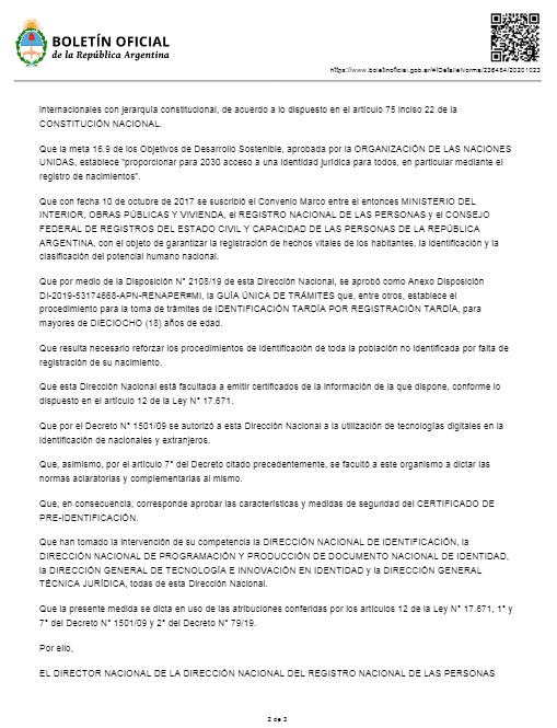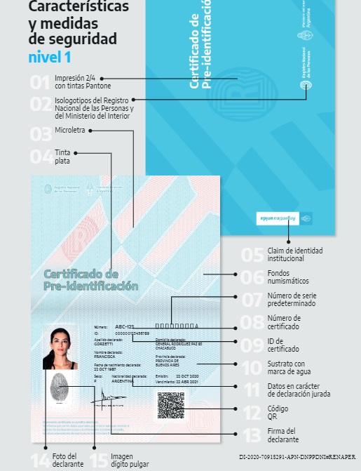 De acuerdo con la Disposición que lleva la firma del Director del Registro Nacional de las Personas (Renaper), Santiago Rodríguez, el Certificado de Pre-Identificación está destinado a "todas aquellas personas que hubieran nacido en territorio argentino, y que carezcan del Documento Nacional de Identidad por no contar con el Acta de Nacimiento".