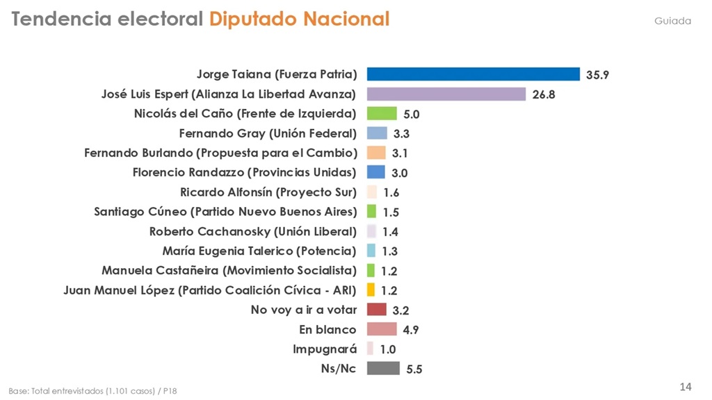 El candidato de La Libertad Avanza, José Luis Espert, se ubica en un segundo lugar con el 26.8% de intención de voto, muy lejos del 35.9% que obtiene Jorge Taiana, de Fuerza Patria.