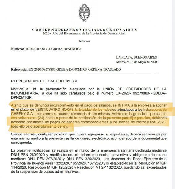 El miércoles el Ministerio de Trabajo bonaerense se expidió sobre la denuncia e intimó a la empresa textil “a abonar en el plazo de 24 horas la totalidad de los haberes adeudados a los trabajadores de Cheeky S.A.”