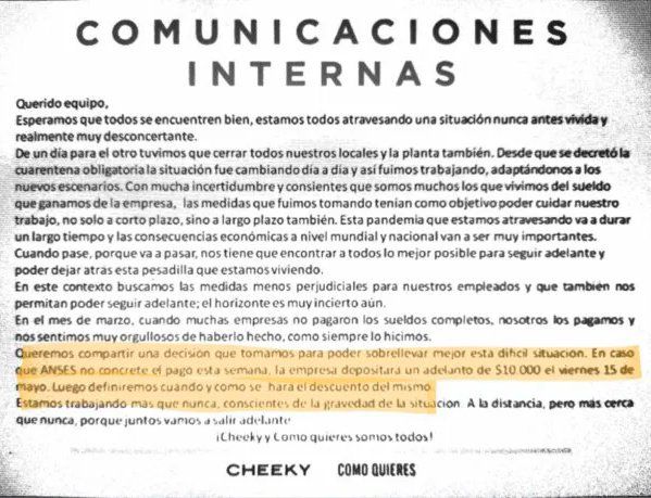 A través de una comunicación interna, Cheeky afirmó que “para sobrellevar esta difícil situación” este viernes “depositará un adelanto de 10 mil pesos” en caso de que “Anses no concrete el pago esta semana”, en alusión a los subsidios ATP que representan la mitad de los salarios privados para empresas en crisis.