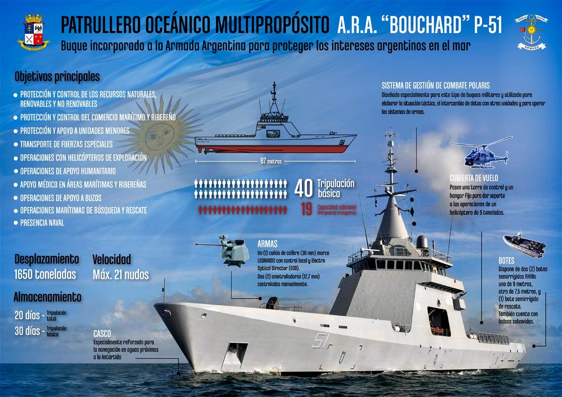 Luego de zarpar el 15 de enero último desde la Base Naval de Toulon, al sur de Francia, al mando del capitán de Fragata Daniel Eduardo Giudici, el patrullero oceánico ARA “Bouchard” P-51, arribará con su dotación compuesta por 32 marinos a la Dársena Norte, y luego seguirá hasta el apostadero en la Base Naval Mar del Plata donde se incorporará a la División de Patrullado Marítimo.