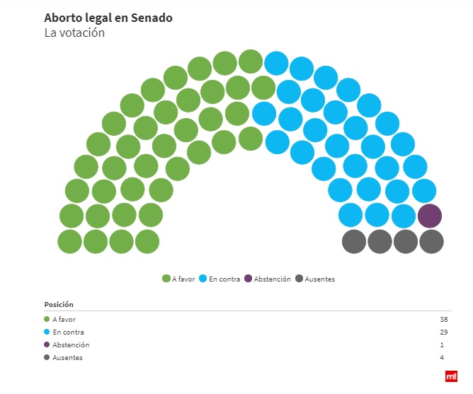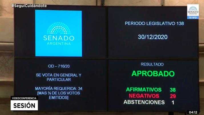 El Senado aprobó esta madrugada la ley de Interrupción Voluntaria del Embarazo, con 38 votos a favor, 29 en contra y una abstención. De esta manera, el aborto es legal, seguro y gratuito en la Argentina. El proyecto, que fue rechazado en 2018 durante el gobierno de Mauricio Macri, había sido una de las promesas de campaña del presidente Alberto Fernández. El debate se extendió por unas doce horas.