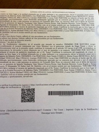 Además se confirmó la elevación a juicio oral de la causa. De este modo Máximo Thomsen (20), Ciro Pertossi (20), Luciano Pertossi (19), Lucas Pertossi (21), Enzo Comelli (20), Matías Benicelli (21), Blas Cinalli (19), Ayrton Viollaz (21), quienes cumplen prisión preventiva en la Alcaidía 3 del penal de Melchor Romero, serán juzgados por el delito de "homicidio doblemente agravado por alevosía y por el concurso premeditado de dos o más personas".