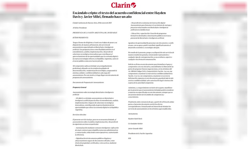 Esta información fue publicada por el diario Clarín, que accedió al texto completo del documento y lo difundió en una nota que destaca su conexión con el colapso del token $LIBRA, impulsado inicialmente por un tuit de Milei que luego fue borrado.