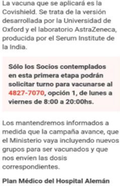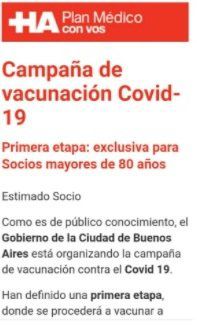 Y aporta como pruebas flyers de prepagas y obras sociales que convocan a vacunarse solo a socios.