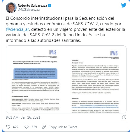 El Consorcio interinstitucional para la Secuenciación del genoma y estudios genómicos de SARS-COV-2, creado por el Ministerio de Ciencia, "detectó el ingreso al país de un argentino residente en Reino Unido, con antecedente de viaje a Austria y Alemania por razones laborales, que arriba asintomático a la Argentina desde Frankfurt a fin de diciembre de 2020 y en Ezeiza resulta positivo de antígenos SARS CoV 2", informó en Twitter Salvarezza.