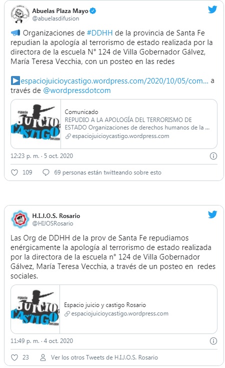 Al respecto, la ministra de Educación de Santa Fe, Adriana Cantero, ordenó el domingo un sumario a la docente, mientras que la secretaria de Derechos Humanos de la provincia, Lucila Puyol, sostuvo que “es muy triste que una docente reivindique a la dictadura o crea que las diferencias políticas se dirimen secuestrando personas”.