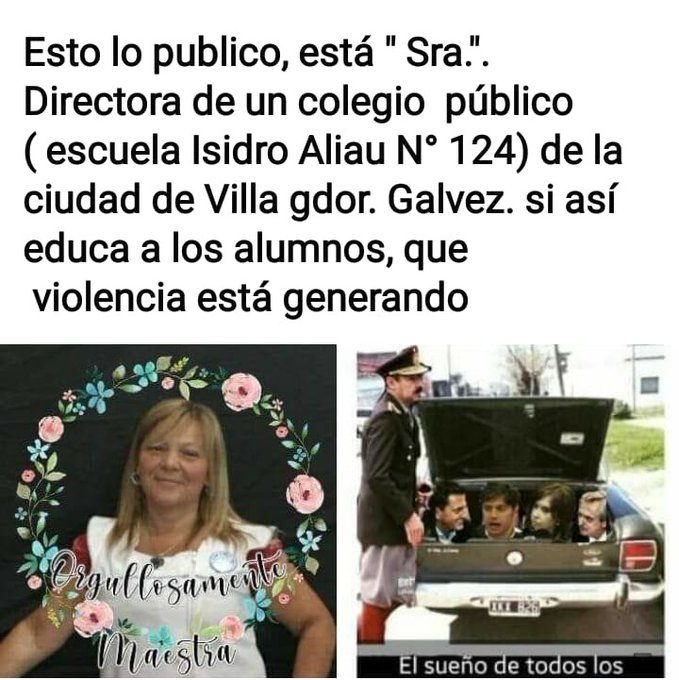 La directora de una escuela de la localidad santafesina de Villa Gobernador Gálvez protagonizó un escándalo al publicar una imagen que simulaba un secuestro perpetuado por la figura del genocida Jorge Rafael Videla, arriba de un Falcon verde, cuyas víctimas eran Alberto Fernández, Cristina Kirchner, Sergio Massa y Axel Kicillok.