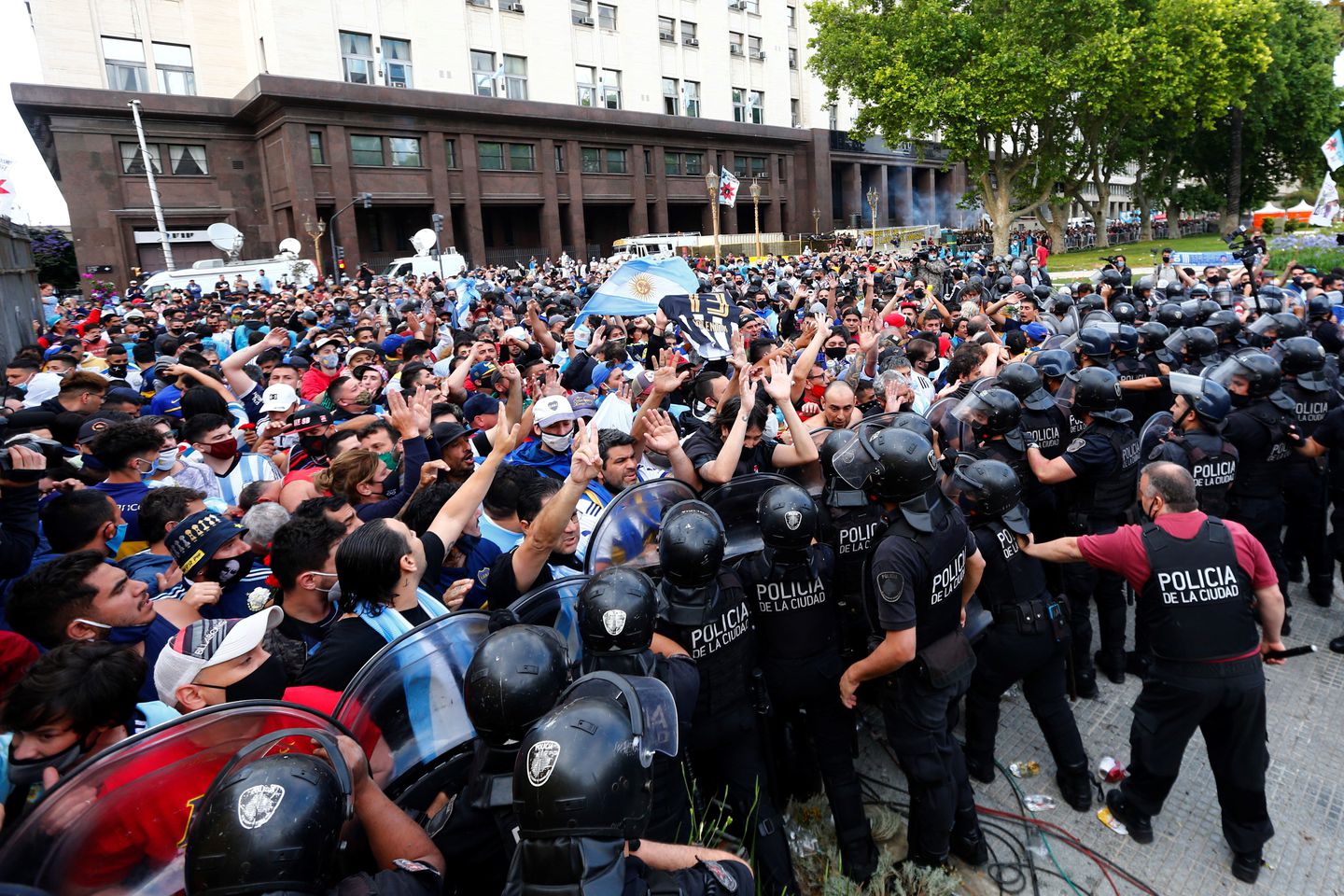 El velatorio se llevó a cabo a cajón cerrado y, pasadas las 13, se cerró la fila de personas que esperaban para ingresar a la casa de Gobierno, que llegó a superar las 20 cuadras. Esa decisión desató incidentes en plena Avenida 9 de Julio entre los fanáticos del Diez y la Policía de la Ciudad.