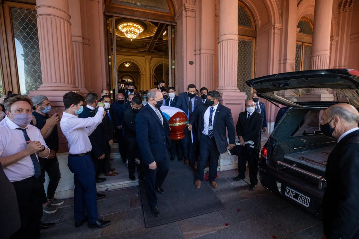 Ante una multitud de fanáticos colgados en las rejas linderas a la Casa Rosada, el féretro con el cuerpo del Diez abandonó poco antes de las 18 su lugar de velatorio para iniciar el cortejo fúnebre que desembocará en el cementerio de Bella Vista. Unos 200 oficiales custodiaron desde temprano la zona. A pedido de la familia y por una cuestión de privacidad, el entierro será íntimo.