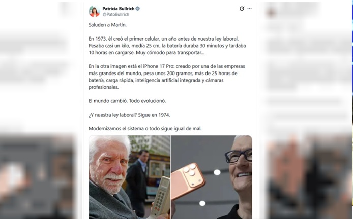 “Saluden a Martín. En 1973, él creó el primer celular, un año antes de nuestra ley laboral. Pesaba casi un kilo, medía 25 cm, la batería duraba 30 minutos y tardaba 10 horas en cargarse. Muy cómodo para transportar...”, inició Bullrich, quien posteó una imagen Martin Cooper.