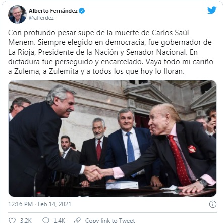 "Con profundo pesar supe de la muerte de Carlos Saúl Menem. Siempre elegido en democracia, fue gobernador de La Rioja, Presidente de la Nación y Senador Nacional", expresó en Twitter.