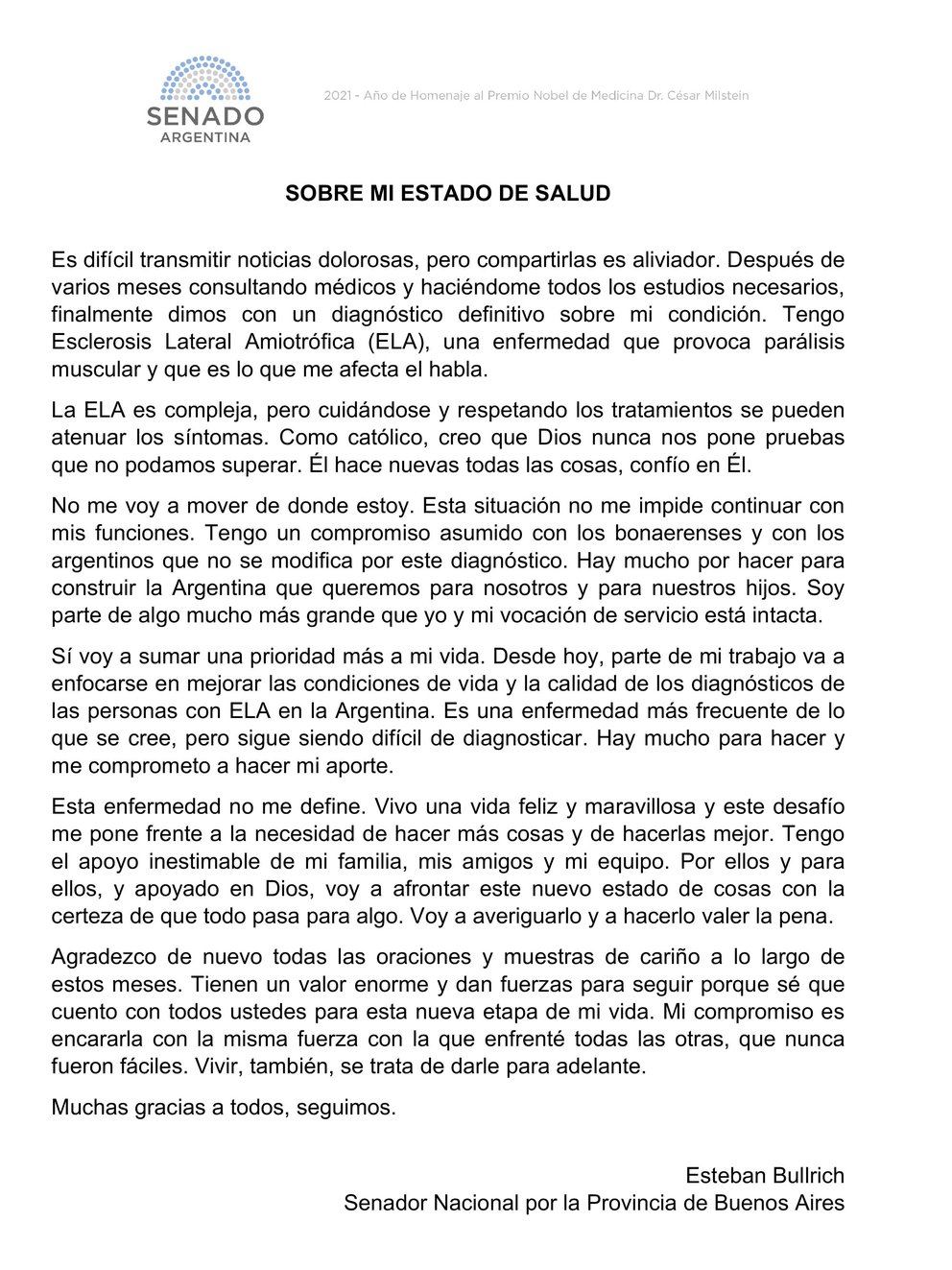 El senador nacional Esteban Bullrich informó hoy, a través de una carta que envió a las autoridades de la Cámara Alta, que padece Esclerosis Lateral Amiotrófica (ELA), una enfermedad que provoca parálisis muscular de manera progresiva.