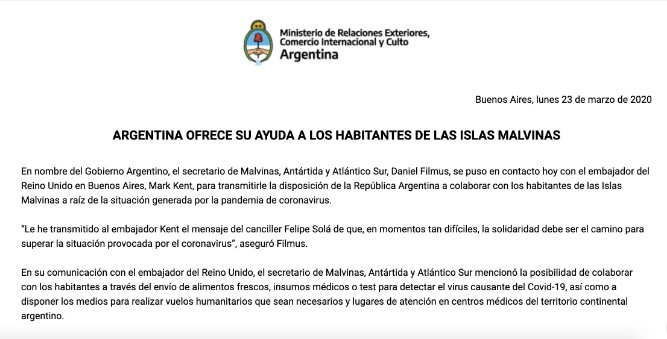 El comunicado informa que, “en nombre del Gobierno Argentino, el secretario de Malvinas, Antártida y Atlántico Sur, Daniel Filmus, se puso en contacto hoy con el embajador del Reino Unido en Buenos Aires, Mark Kent, para transmitirle la disposición de la República Argentina a colaborar con los habitantes de las Islas Malvinas a raíz de la situación generada por la pandemia de coronavirus”.