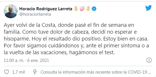 El jefe de Gobierno porteño, Horacio Rodríguez Larreta, contrajo coronavirus luego de pasar el fin de semana en la Costa Atlántica junto con su familia, hasta donde se trasladó por las celebraciones de Año Nuevo.