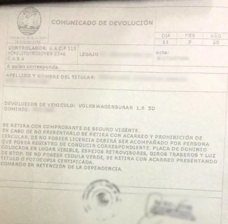 El lunes, esta persona de 35 años se presentó en la Comisaría Vecinal 9 B, en el barrio de Liniers, para retirar una Volkswagen Suran que estaba retenida en un playón policial con un Certificado de Devolución emitido por la Unidad Administrativa de Control de Faltas del Gobierno de la Ciudad.