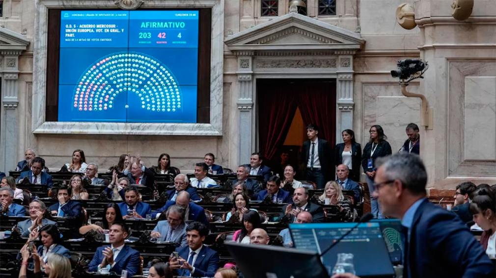 El oficialismo consiguió este jueves en la Cámara de Diputados la ratificación del acuerdo de libre comercio entre el Mercosur y la Unión Europea con 203 votos positivos, 42 en contra y 4 abstenciones. Ahora el tratado deberá pasar por el Senado para comenzar a ser aplicado.