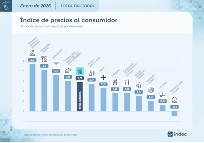 La inflación se aceleró por quinto mes consecutivo y se ubicó en el 2,9% durante enero, marcando su nivel más alto desde marzo de 2025 cuando alcanzó el 3,7%, según informó el Instituto Nacional de Estadística y Censos (INDEC). El dato se realizó nuevamente en base a la canasta de bienes y servicios de 2004/05, en medio de la polémica por la salida del nuevo índice de precios al consumidor (IPC) que debería haber debutado este martes, pero que el ministro de Economía, Luis "Toto" Caputo, decidió que no viera la luz.