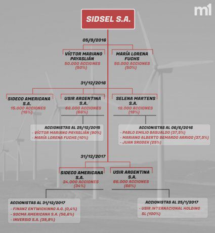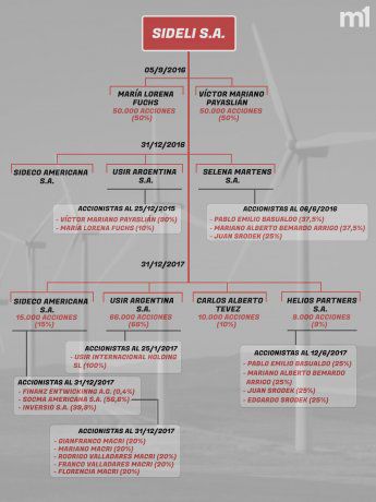 Casualmente, Payaslian y María Lorena Fuchs constituyeron la sociedad “Parques Eolicos Miramar SA en marzo de 2016 con un capital social de tan solo $100.0000 pesos. Pero un mes más tarde, el matrimonio Payaslian y Fuchs transfirieron el 100% de las acciones a SIDECO AMERICANA SA y SOCMA AMERICANA SA, las dos empresas holding del clan Macri. En noviembre, la empresa presentó su oferta para el procedimiento Ronda 1.5 e informó su conformación por: Isolux Ingeniera SA (socio estratégico conforme pliego) y Selena Partners SA. Para entonces, Isolux se estaba retirando del negocio de la energía eólica en Argentina: quería desprenderse de los otros 4 parques y arrastraba deudas. En diciembre de 2016, se informó ante la AFIP que el 90% del capital social pertenecía a Isolux Ingeniera SA-IECSA SA UTE (90%), entonces en manos de Ángelo Calcaterra. Finalmente, la composición accionaria se modificó por: Selena Partners SA (10%) y Sideco Americana SA (90%). Todo en manos de la familia del expresidente.