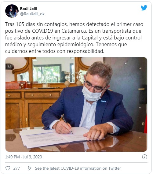 "Tras 105 días sin contagios, hemos detectado el primer caso positivo de COVID19 en Catamarca. Es un transportista que fue aislado antes de ingresar a la Capital y está bajo control médico y seguimiento epidemiológico. Tenemos que cuidarnos entre todos con responsabilidad", explicó Jalil.