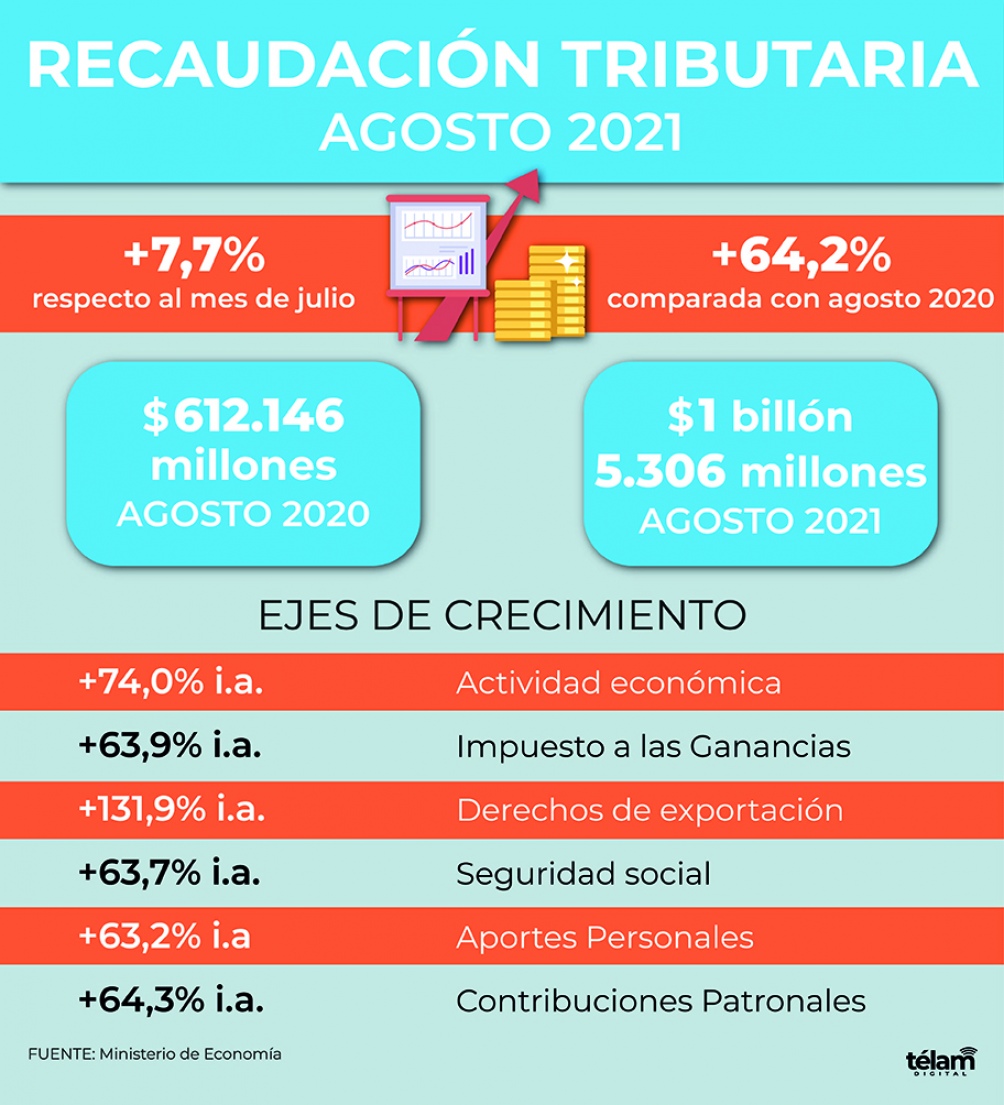 El informe detalló que en agosto los ingresos en concepto de impuestos Internos Coparticipados subieron 60,5%, al sumar $ 21.300 millones; mientras que el Impuesto a los Créditos y Débitos marcó una mejora de 66,%, al alcanzar casi $ 64.000 millones.