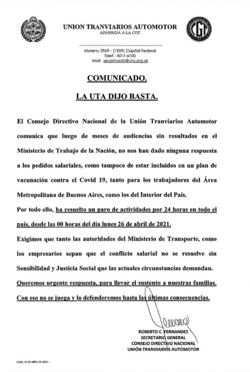 La decisión de adoptar la medida de fuerza fue anunciada por la UTA a través de un comunicado de prensa firmado por su titular, Roberto Fernández, frente a la falta de avances en las negociaciones salariales.