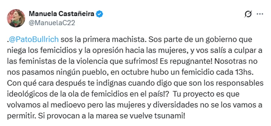 A través de sus redes sociales, Castañeira respondió a declaraciones recientes de Bullrich en las que deslizó críticas hacia el movimiento feminista, tras los múltiples casos de femicidios ocurridos en el país. “Sos parte de un gobierno que niega los femicidios y la opresión hacia las mujeres, y vos salís a culpar a las feministas de la violencia que sufrimos. ¡Es repugnante!”, expresó.