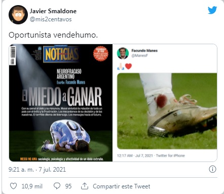 Fue tapa de la revista Noticias el artículo de Manes que decidió titular “El miedo a ganar”, en el que analizó la psiquis y sentimientos del ídolo. “Con su penal al cielo y su renuncia, Messi sintetizó la relación de todo un país con el éxito y la frustración. Los mecanismos de su decisión y de las nuestras. El terrible dilema del liderazgo. Los mensajes hacia el futuro”, decía el extracto.