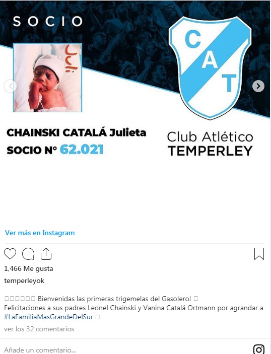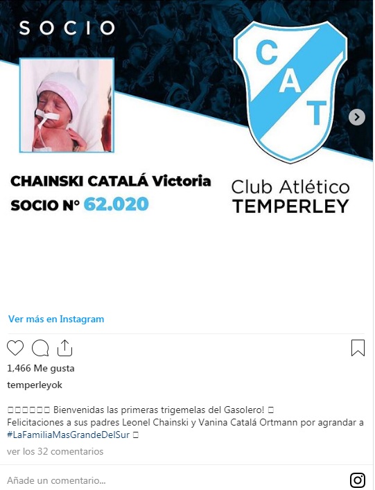 Leonel es fanático de Temperley y sus hijas ya son socias del club, que además de darles los carnets les dio la bienvenida a "las primeras trigemelas del Gasolero", a través de una comunicación oficial.