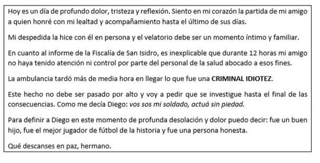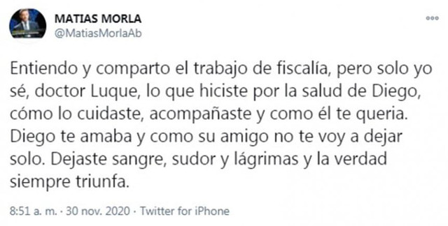 El propio Morla fue el que pocas horas después de la muerte de Maradona publicó un comunicado en el que deslizó que la ambulancia tardó más de media hora y lo calificó de “criminal idiotez”. Esta mañana defendió al médico Leopoldo Luque, quien se presentó para declarar de manera espontánea.
