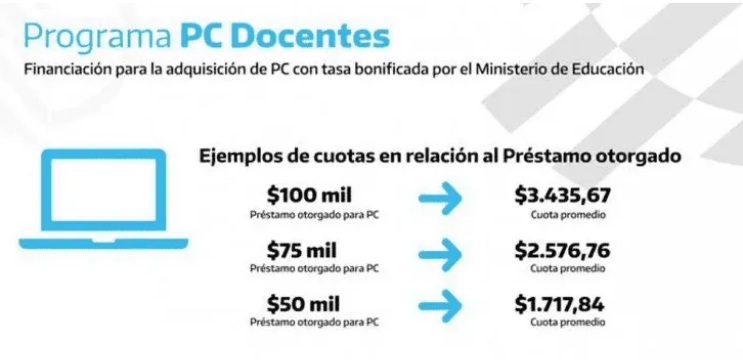 "Las y los docentes cuyo ingreso equivale hasta cuatro salarios mínimos, vitales y móviles, podrán acceder a créditos de hasta 100 mil pesos, con una tasa de interés del 12%, con 36 cuotas de $1700 (promedio) para equipos de hasta $50.000, $2.500 para aquellos de hasta $75.000 y $3.400 para los que alcancen los $100.000", comunicaron desde el organismo.